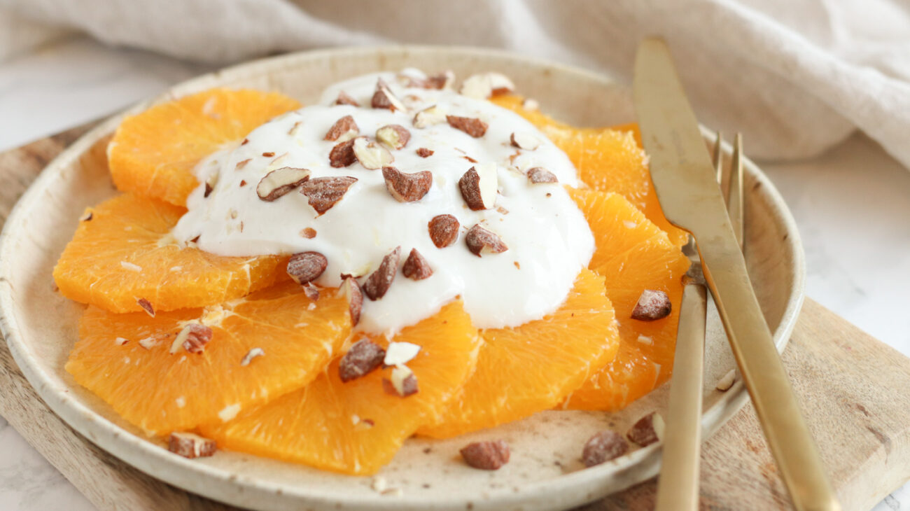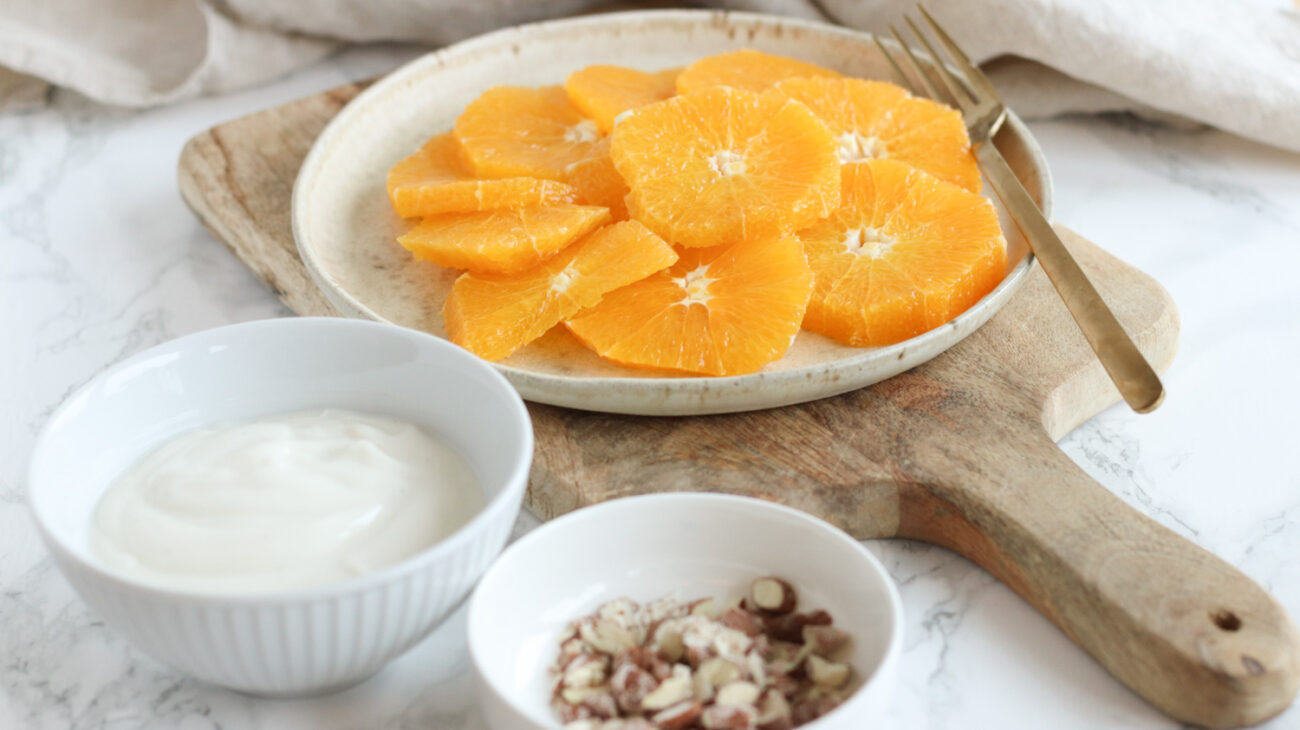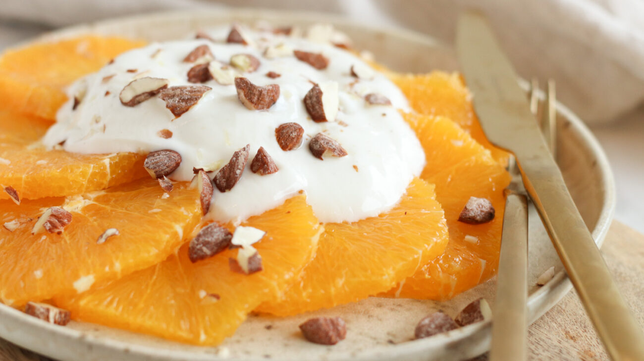 Appelsiner med vaniljeskyr og saltede mandler kan være hel og delvis sukkerfri, alt afhængigt af hvilken skyr du vælger.